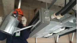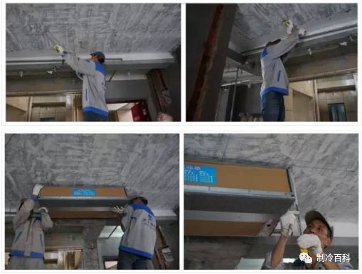 ①吊裝中央空調(diào)室內(nèi)機(jī),并對內(nèi)機(jī)進(jìn)行包裹,避免有灰塵雜質(zhì)進(jìn)入;